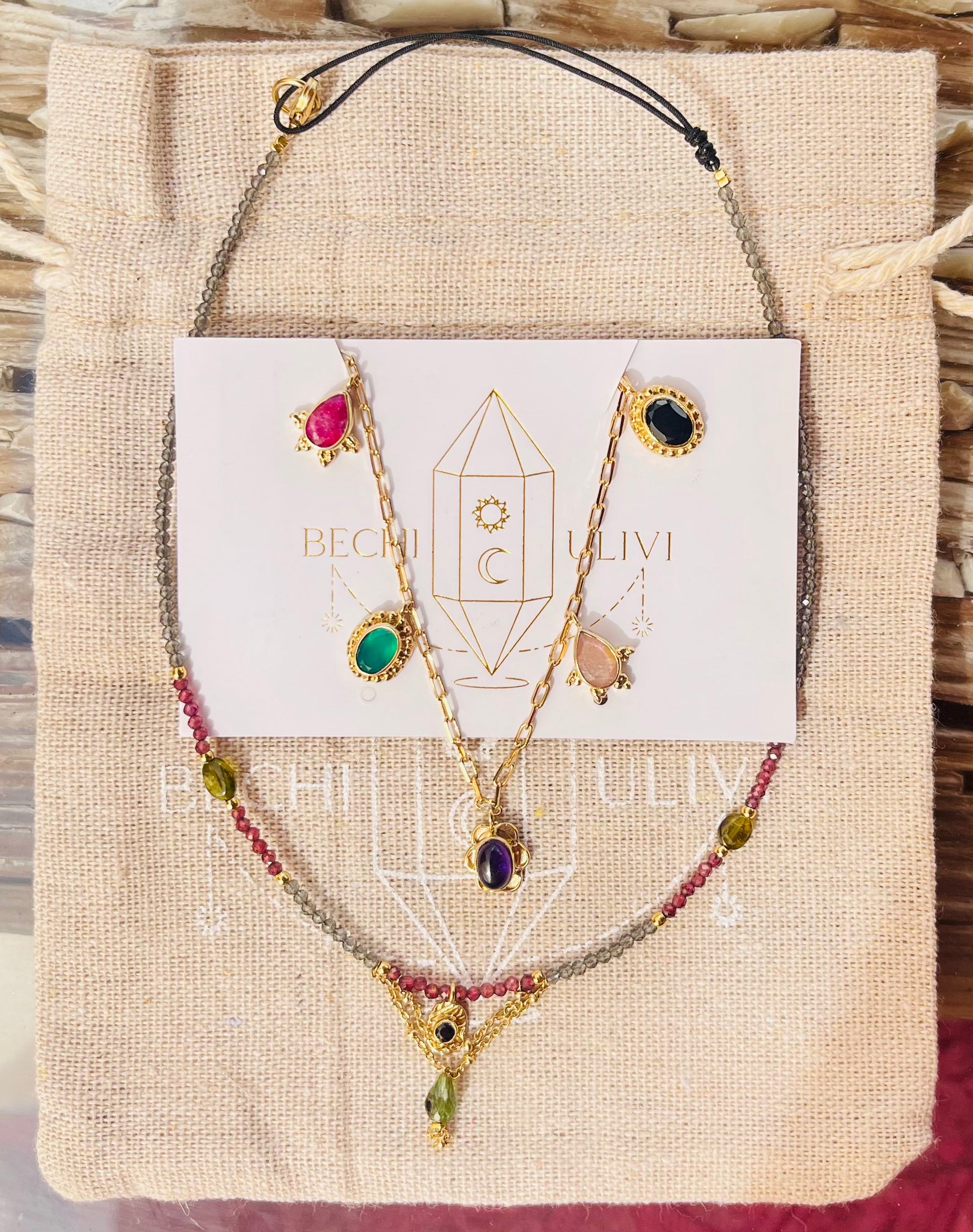 Gargantilla de piedras naturales talladas en 2 mm con cadenas de latón chapado en oro. El cordón es ecológico de tintes naturales y ajustable.