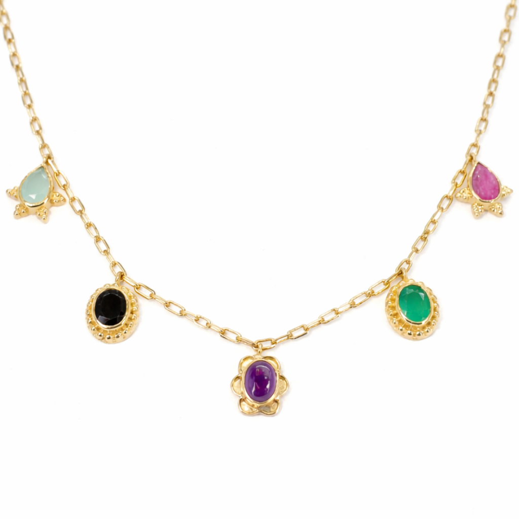 Collar de cadena de latón chapado en oro, con colgante central en calcedonia azul.