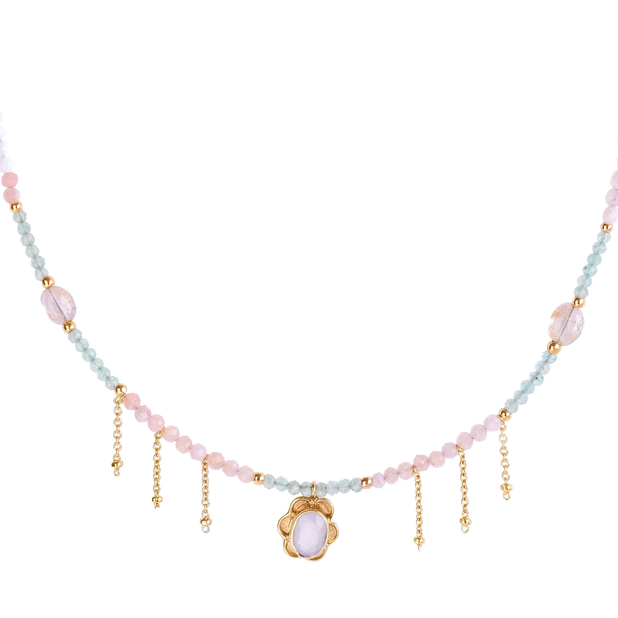 En Bechi Ulivi Jewels, Nos enorgullecemos de nuestra impecable artesanía. Cada collar está elaborado a mano con sumo cuidado, con piedras naturales que cuentan su propia historia. El ópalo rosa, junto con la suave prehnita verde y la delicada calcedonia rosa, se seleccionan cuidadosamente por su belleza y energía. Nuestra cadena de latón chapado en oro, fabricada en España, garantiza durabilidad y añade un toque de lujo. Con una longitud ajustable de 34 a 40 cm, está diseñada para ajustarse a la perfección, realzando tu escote sin esfuerzo..
