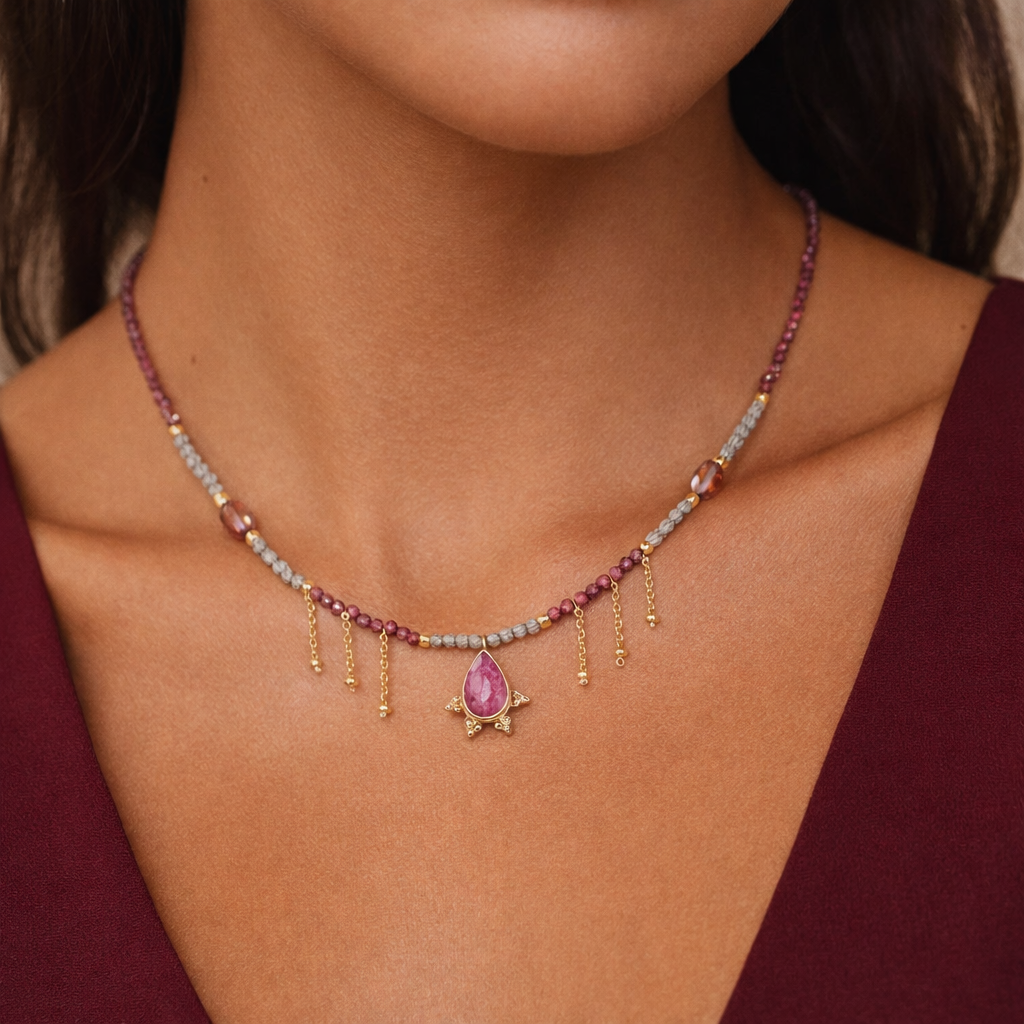 La gargantilla Ana granate de Bechi Ulivi Jewels no es solo un accesorio; es una declaración de estilo, un recuerdo de momentos especiales y una promesa de elegancia que te acompañará en cada paso.