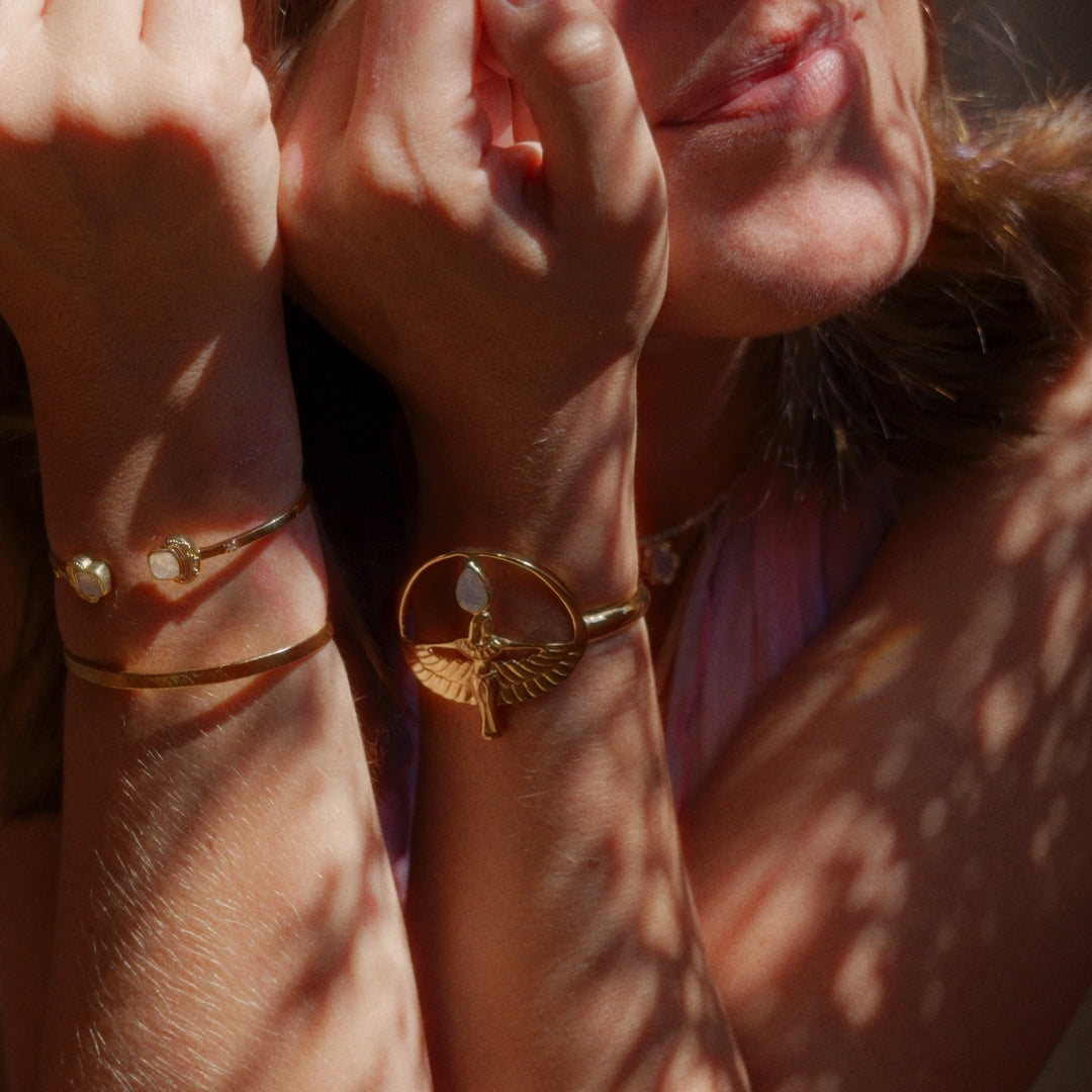 Pulsera de latón chapada en oro con piedra tallada natural en amazonita.