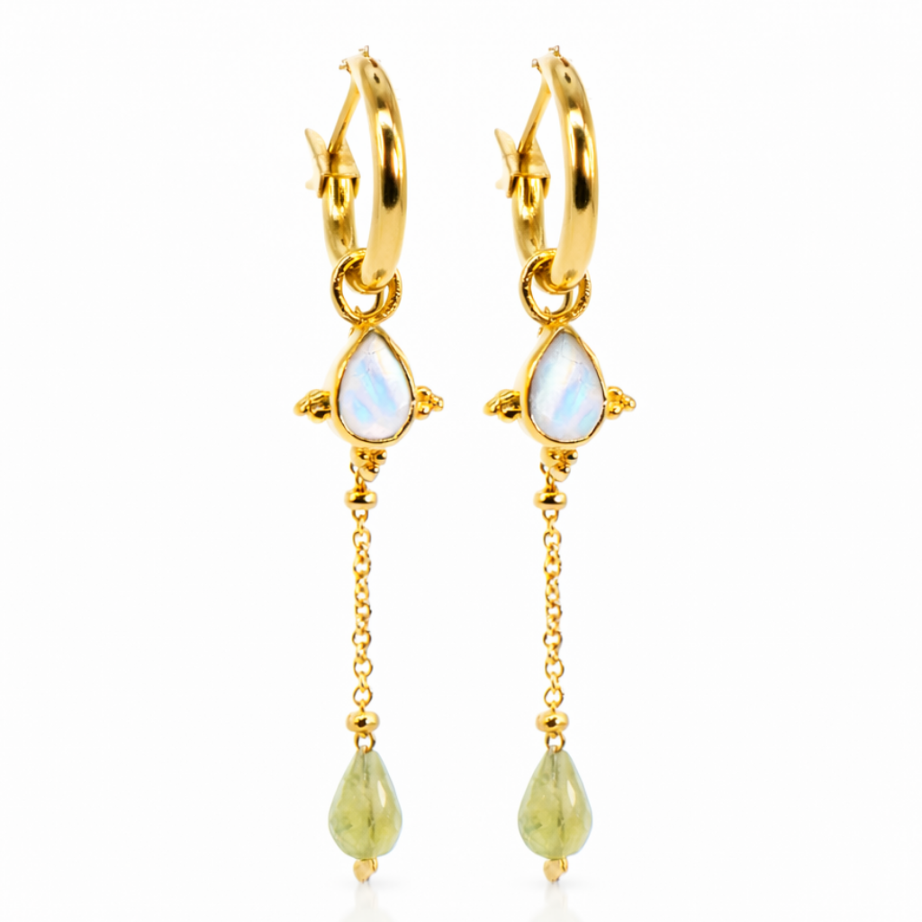 Pendientes de aro de latón chapado en oro (1 Micra) con piedra luna blanca.
