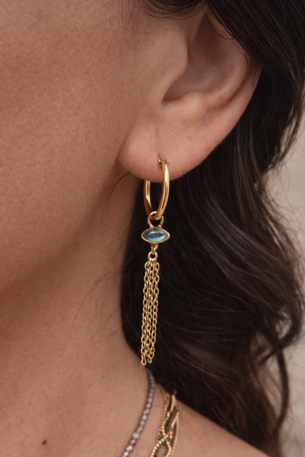 Los aros Sira con labradorita están elaborados con latón chapado en oro de 1 micra, garantizando una durabilidad excepcional y un acabado brillante que perdura en el tiempo. Cada pieza es un testimonio de la maestría artesanal española, donde la atención al detalle se traduce en joyas que no solo se ven hermosas, sino que también se sienten como una extensión de tu propio estilo.