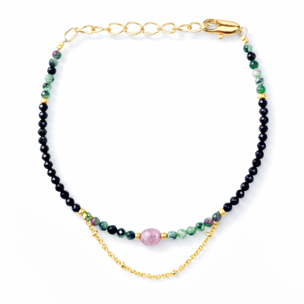 La pulsera Ana Espinela, elaborada con piedras naturales de zoisita, espinela y turmalina rosa, no solo adorna tu muñeca, sino que también lleva consigo la energía de la naturaleza. Cada piedra ha sido seleccionada por su belleza única y sus propiedades significativas. La espinela, por ejemplo, es conocida por su capacidad para revitalizar y aportar energía positiva, haciéndola perfecta para quienes buscan equilibrio y renovación en su vida diaria.