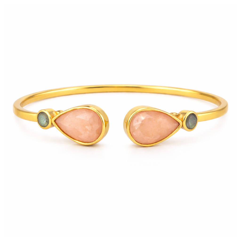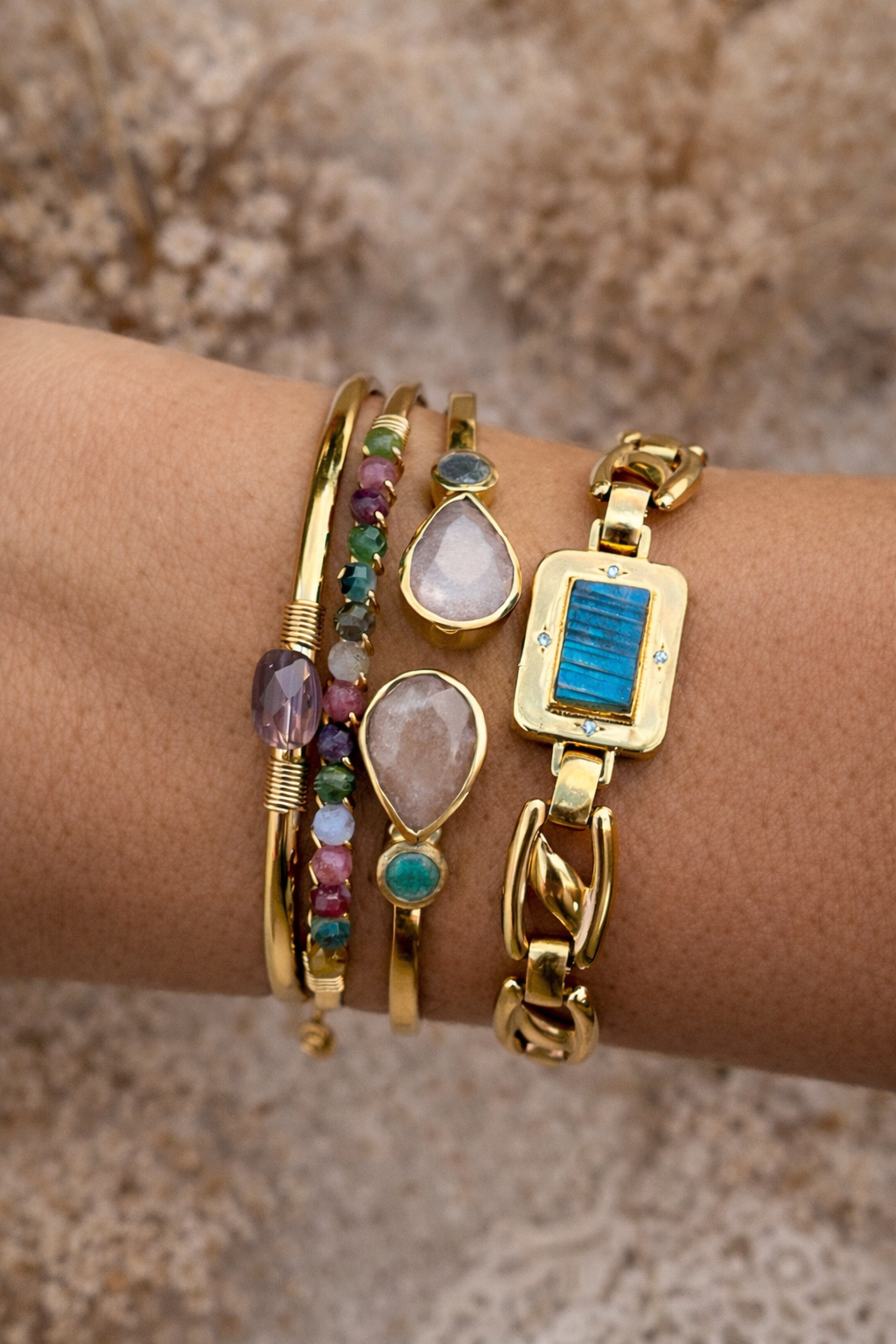 Cada pulsera ha sido cuidadosamente elaborada con chapado en oro de 1 micra y adornada con piedras de labradorita. Hecha a mano en España, cada pieza refleja la dedicación y el amor que Bechi Ulivi Jewels pone en su trabajo. La autenticidad de las piedras naturales y su diseño elegante garantizan que posees una obra maestra.
