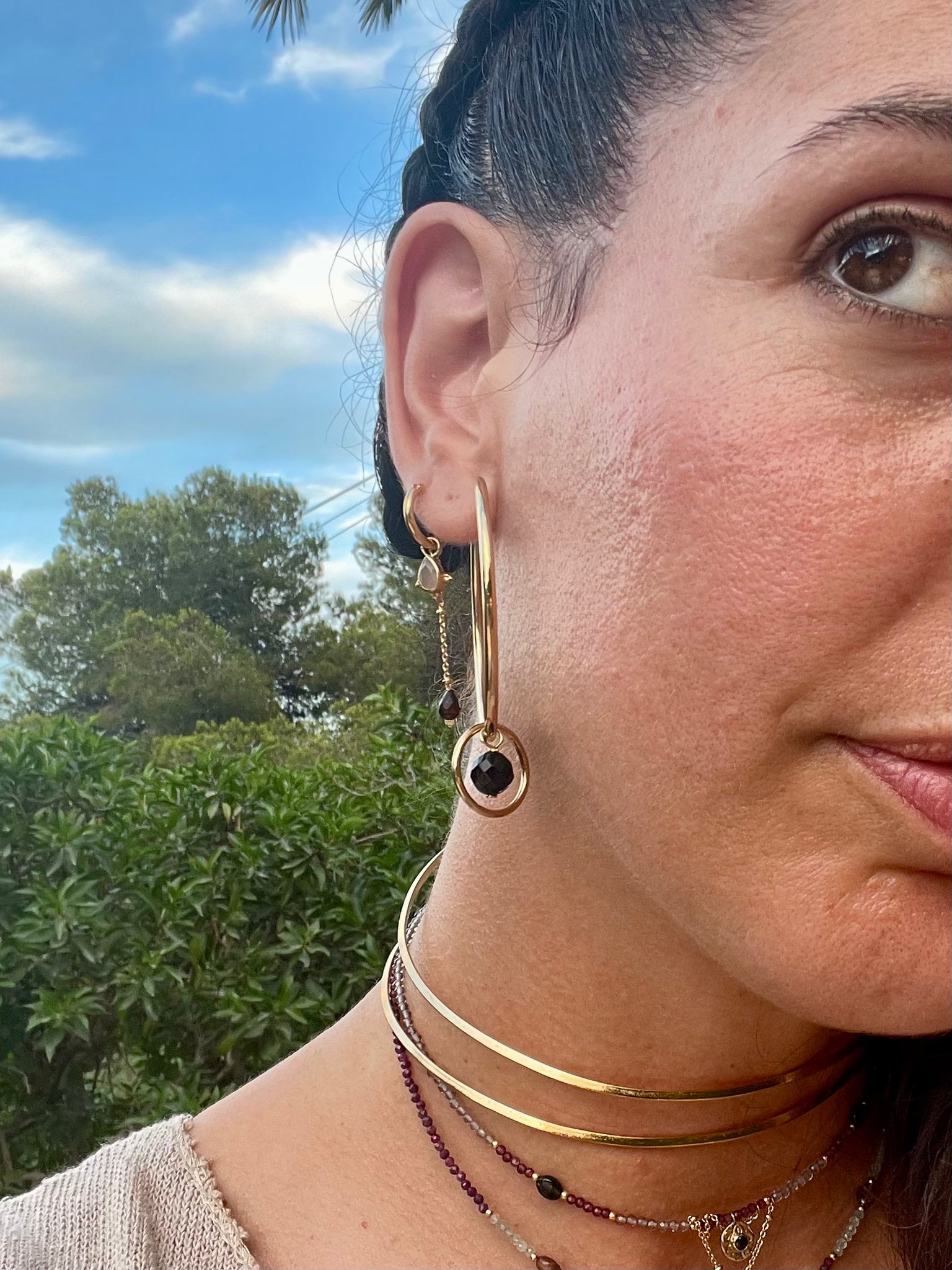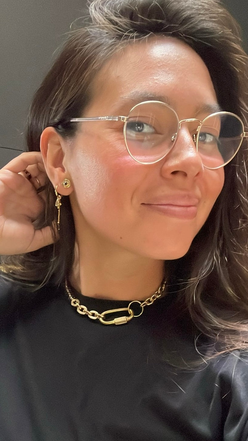 aros con cadena bañados  en oro con piedra Adularia  y Turmalina por Bechi Ulivi Jewels.